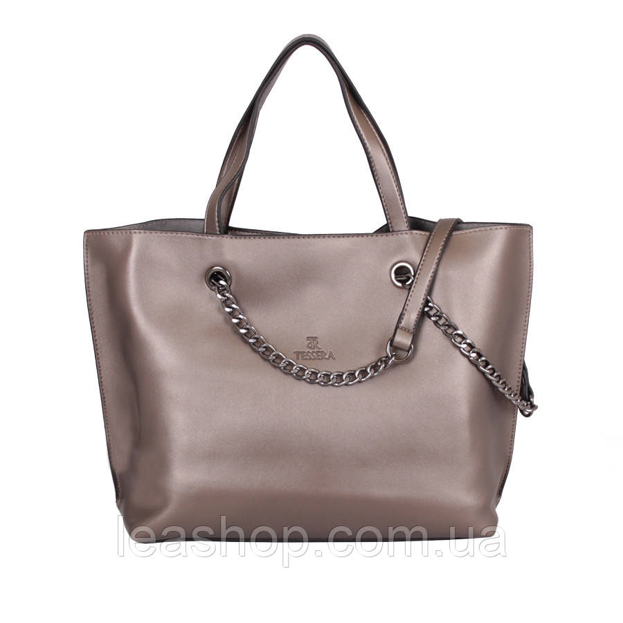 Стильна і містка сумка на довгих металевих ручках-ланцюжках, а також в комплекті дві короткі ручки. Всередині кишеня на блискавці й два кишеня для мобільного телефону.